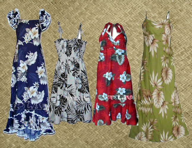 フラダンス用からムームー、ワンピース、ノースリーブ、チュニックなど、豪華なものから気軽に着れるものまで様々なシーンに応じたたくさんの種類のドレスをご用意しております。もちろん全てMade in Hawaii、是非ハワイの風を感じて下さい!