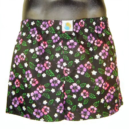 このトランクスは、とってもカラフルな紫と白、サーモン色のハイビスカスが、真緑の葉が落ちついは黒色の背景に映えるようプリントされています。シンプルかつアクティブさをイメージしました。通常のハイビスカスよりもワンランク個性的な柄となっています。ハワイを象徴するハイビスカス柄のこのトランクスを自信を持ってお進めします。シンプルかつクールさを兼ね備え、高級感たっぷりの仕上がりとなっています。
