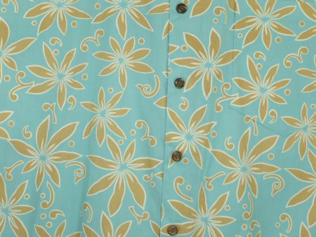 襟は開襟(オープン)タイプのアロハシャツで、左胸にポケットがついているデザインとなっておりボタンは全てココナッツボタンを使用しています。